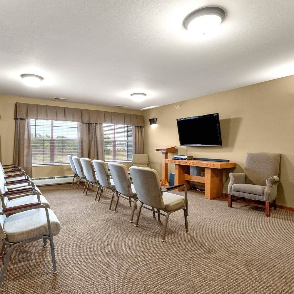 Common areas: Community lounges, chapel, salon/barber shop, library, and whirlpool spa